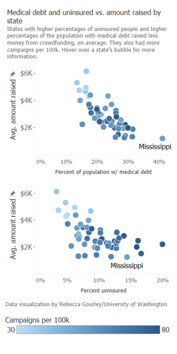 • Similarly, there were more campaigns in states with higher percentages of people with medical debt and without insurance. Those campaigns raised less money than campaigns in other states. Mississippi, for example, has the highest percentage of the population with medical debt and is among the highest in percentage of uninsured, but crowdfunding campaigns there raised the least money of all 50 states.